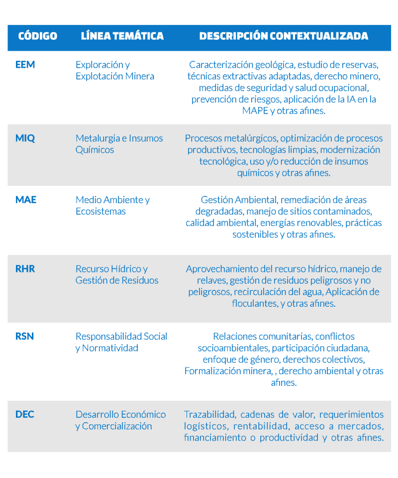 Cada participante de acuerdo a su categoría presentará su investigación en alguna de las seis temáticas que abarcan los principales retos y oportunidades de la MPE